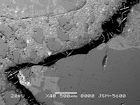 BEI拍攝的與上圖相同 裂縫表明澎內傳系統 生成晶體正在密封該裂縫 |